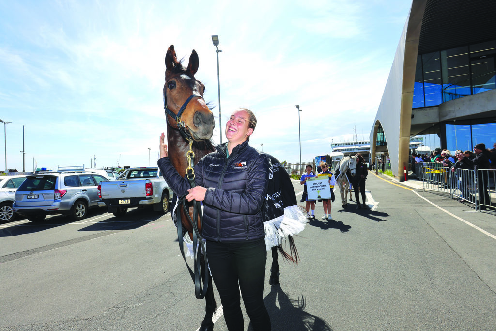 The arrival officially started the Grand Parade at the Searoad Ferries Terminal, with the Melbourne Cup on public display until 1pm.