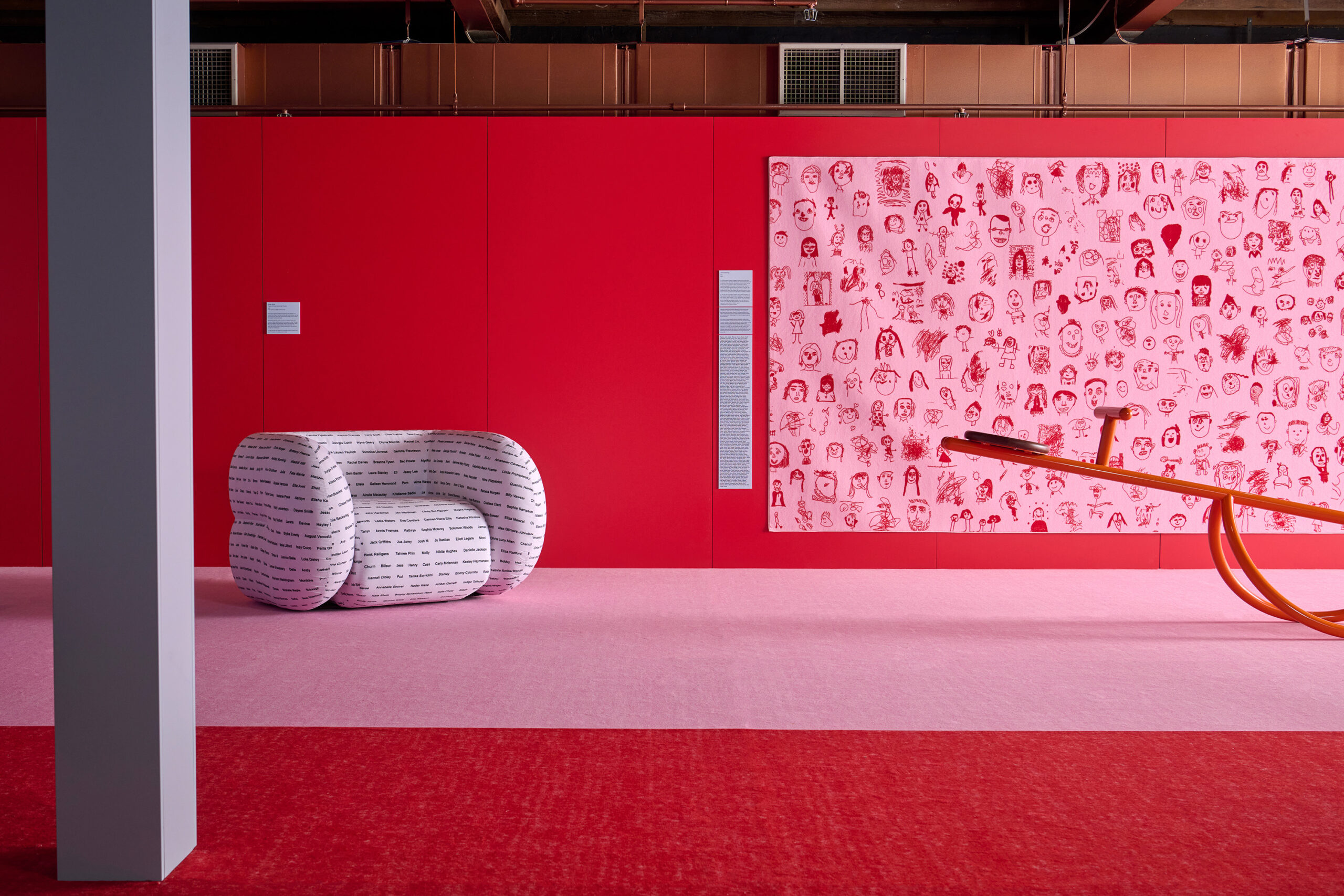 Within the exhibition is a “Self Portrait Rug”, a major collaboration with MoPa and GH commercial. Children were asked to draw their portrait, which was then digitally printed onto a 10 by two metre rug.