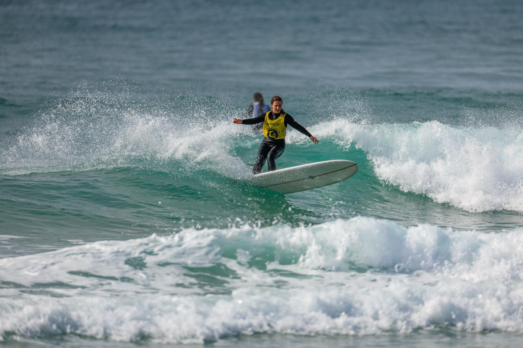 Anglesea surfer Emma Webb looked in dominant form from the outset of the Over 40 Women Longboard division on Tuesday and showed off her incredible technical repertoire in the tricky conditions.