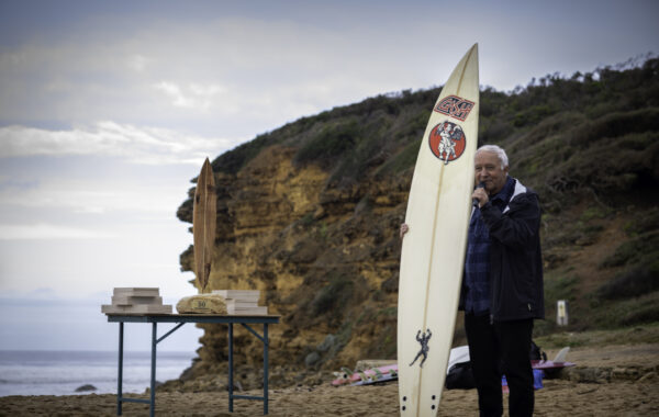 A wooden replica of one of Shaun’s surfboards was also unveiled by invitee Jeff Sweeney as the trophy for this year’s Bells Beach 50 Year Storm winner.